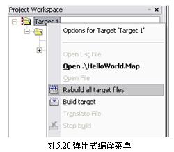 通过在工程窗口“Target 1”上点击右键,也可以弹出相应的编译菜单,各命令含义和上面一致。