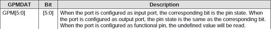 把这个引脚设置好后,我们可以通过改变GPMDAT的值来改变引脚上的电平。下面是GPMDAT: