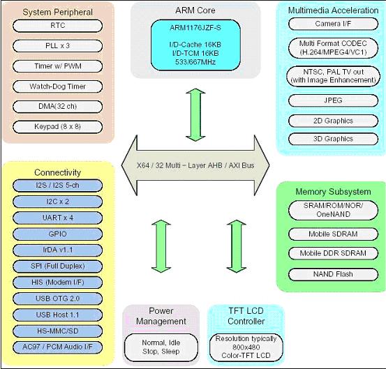ARM Core:采用ARM1176JZF-S的核,包含16KB的指令数据Cache和16KB的指令数据TCM,ARM Core电压为1.1V的时候,可以运行到553MHz,在1.2V的情况下,可以运行到667MHz。通过AXI,AHB和APB组成的64/32bit内部总线和外部模块相连。