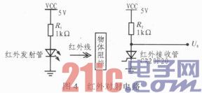 本系统在设计时,尽可能采用最简单的电路设计来完成相应的功能,按照主动式报警器的原理。所设计的其中一对红外对射电路如图4所示。采用了一个发光二极管,再接上一个上拉电阻,构成红外发射电路;采用CR20F20光敏晶体管连接上拉电阻,构成红外接收电路。当有人越过黄色警示线,也即有物体阻挡红外对射电路时,接收电路部分的输出电压Uo会产生电平变化,从而驱动单片机进入告警状态。系统设计总图的其他外围电路的设计采用天津锐志单片机公司所出产的单片机开发板P89V51RD2上的外围电路即可。