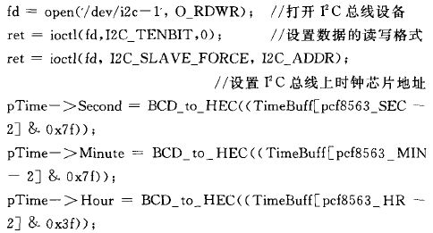 本系统通过读取挂在I2C总线上的实时时钟芯片来获取时间信息,通过温度传感设备获取温度信息。本文以读取实时时钟芯片的数据为例,操作如下: