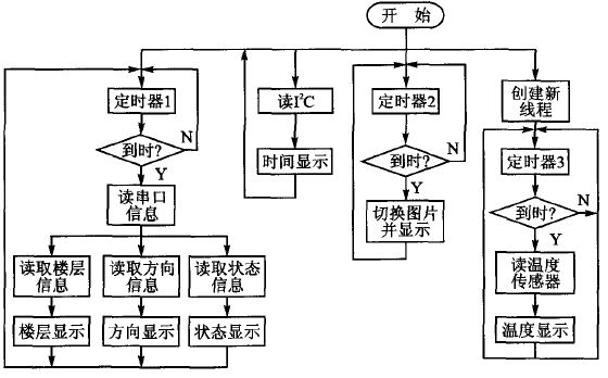 图形界面开发是Qt/Embedded开发的一个重点,本系统的界面结构包括楼层信息区域、运行方向区域、图片显示区域、温度时间显示区域、状态显示区域、本系统涉及到视图的跳转、数据的传递、控件的使用、布局和事件处理等等。其程序流程如图4所示。