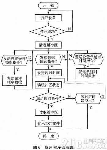 应用服务程序直接面向用户,是控制数据存储软件的最上层,不仅提供与用户交互的界面,而且能通过发送各种控制命令来控制存储模块的工作。在Windows 中,LabView实现与WDM的通信过程是:先用CreateFile函数打开设备,然后用Devi—ceIOControl与WDM进行通信,包括从 WDM中读数据和写数据给WDM,也可以用ReadFile从WDM中读数据或用WriteFile写数据给WDM。当应用程序退出时,用 CloseHartdle关闭设备。其软件设计流程如图6所示。