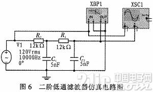 AD9708芯片差分输出以后,为了防止噪声干扰,电路中接入了二阶低通滤波器,截止频率为1 kHz,其Multisium仿真电路如图6所示。