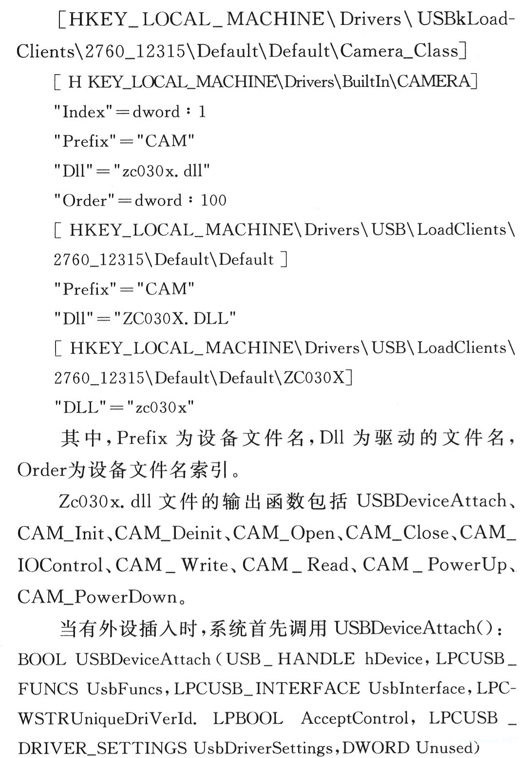 动开发工作,最后成功开发出Zc030x在WinCE5.0下的驱动程序。下面结合USBCamera驱动开发说明驱动中的数据流向和必要的函数使用。首先是具体的注册表信息: