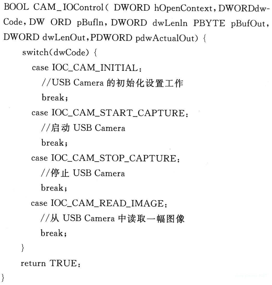 其中,hOpenContext是设备驱动的引用事例句柄,由CAM_Open创建。本驱动中,所有对USB Camera的操作均通过IOControl()映射到CAM_IOControl来完成。下面是CAM_IOControl的部分源码分析:
