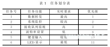 要完成实时多任务的各种功能,必须对任务进行划分。本程序根据各个任务的重要性和实时性,把程序分成六个具有不同优先级的任务,包括系统监控、数据转发、键盘输入、LED显示、接收队列监视和波特率设置。表1为任务划分表。