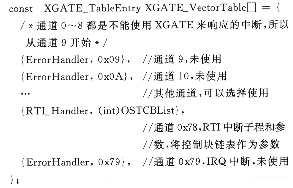其中,OSTCBList是XGATE响应RTI中断时需要带入的参数,这里这个参数是μC/OS-II任务控制块链表的首地址;XGATE_TableEntry是一个编译器自定义的结构体变量类型;XGATE_VectorTable[]是XGATE的中断向量表。写好XGATE的中断向量表后,使用XGATE实现μC/OS-II时钟节拍的设置过程就完成了。