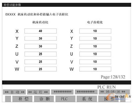 (3)机床传动比和电子齿轮比界面。如图4所示,机床传动比和电子齿轮比主要用于配置各轴补偿输出值与实际执行机构动作的比例关系。