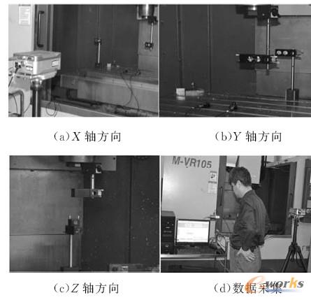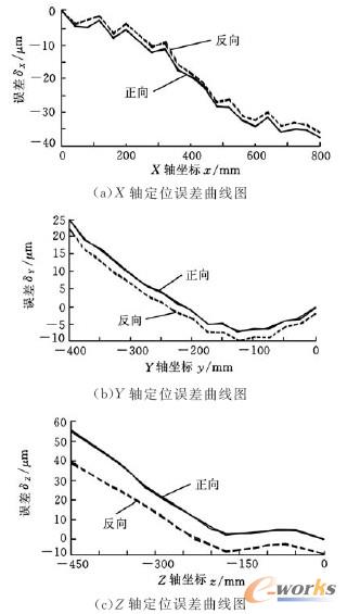 实验用机床为M-VR105 三轴数控机床,数控系统为广州数控设备有限公司生产的GSK 25i数控系统;误差测量设备为雷尼绍激光干涉仪。实验时首先应用雷尼绍激光干涉仪检测三轴机床三个平动轴的定位误差,如图6 所示。图7 所示为机床定位误差检测结果,其中实线表示测试参考坐标从0 到800mm 位置运动(正向)所测试的重复3 次定位误差数据;虚线表示测试参考坐标从800mm 到0 位置运动(反向)所测试的重复3 次定位误差数据。由图7 可以看出,机床X 轴定位误差最大为-38μm,误差曲线随机床坐标的增大而增大;Y 轴定位误差最大为32μm,误差曲线呈非线性分布;Z 轴定位误差最大为57μm,误差曲线呈非线性分布。