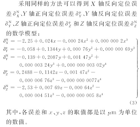 将X 轴正向定位误差检测数据代入式(1),可得一正规方程组,应用最小二乘理论可得机床X 轴正向定位误差模型: