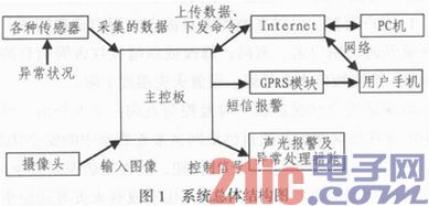 该系统以FS_S5PC100开发板和Linux操作系统作为实验平台,主要立足互联网,采用摄像机采集图像,经压缩处理后传到互联网,远端用户可以通过浏览网页或手机上网直接查看家中情况。利用市场上比较通用的GPRS模块收发信息,利用Linux内核中的PPP拨号上网的方式;使用嵌入式Linux操作系统,通过交叉编译模式,使用C语言编写移植驱动和控制程序,并在Linux系统中搭建视频服务器、WEB服务器和SQL ite数据库。系统的总体设计框架如图1所示,整个系统分为以下3个模块: