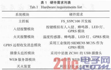 根据系统的总体架构,分析远程安防监控系统功能上的需求,得知相应的硬件需求如表1所示。