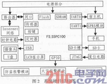 间层,既要处理输入模块采集的数据,又要控制输出模块的相应处理,同时还得与远程监控中心进行数据交互,这就要求其具有较强的数据处理能力。基于此考虑,本系统选用了基于Samsllng公司的Cotex_A8内核的FS_S5PC100作为实验平台。考虑到市场的普及度与可靠性的要求,GPRS模块选用SIEMENS公司的TC35i/MC35,该模块内嵌强大的TCP/IP协议栈,低功耗,增强的AT控制指令。由于具体的硬件设计电路图比较繁杂,在此给出系统硬件实现框图,如图2所示。