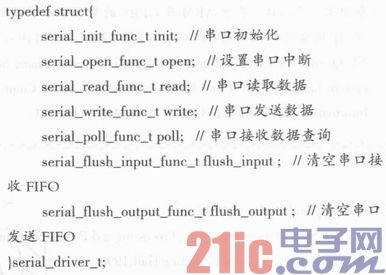 在定义与串口相关寄存器地址的基础上,以结构体构造新的串口数据类型,结构体成员为函数指针,它们指向编写的具体实现函数,而函数体中的数据直接操作串口寄存器,实现了串口驱动程序,实际上就是上面驱动程序思想,填充对应的file_operations中的接口函数,实现我们自己的驱动程序。以下是实现串口数据类型的主要源代码:
