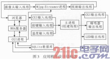 在搭建好系统环境,成功移植硬件驱动后,在Ubuntul2.04上Linux2.6内核环境下进行程序的开发调试。系统中主要的进程,包括3个线程等待控制命令,在代码中采用轮询的形式来对线程状况进行检测,发生问题的时候进行相应得处理,用户可通过网络访问本系统并远程进行控制操作。调用了两个线程分别操作thief处理线程和fire处理线程。thief线程和fire线程分别调用GPRS模块和摄像头模块进行短消息的发送和图像的采集及保存。同时调用FS_S5PC100开发板自带的,蜂鸣器模块和LED模块实现报警,另外利用流水灯模拟灭火的操作。具体框架如图3所示。