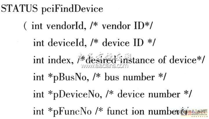 (1)查找CompaetPCI设备在VxWorks操作系统中通过函数peiFindDeviee()来实现,该函数可根据给定的设备标识和供应商代码找到相应的设备。并返回总线号、设备号以及功能号。函数的定义如下:
