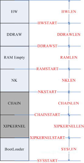 方框指的是每个范围领域的内容,如果方框为灰色,意味着这两个领域只有在XIP模式下才有效。而红色的字体,对应magellan.bib文件中相应的宏,表示需要需要设置的数值。从图中可以看出,需要设置的数值分为两个,一个是起始地址,另一个则是大小。
