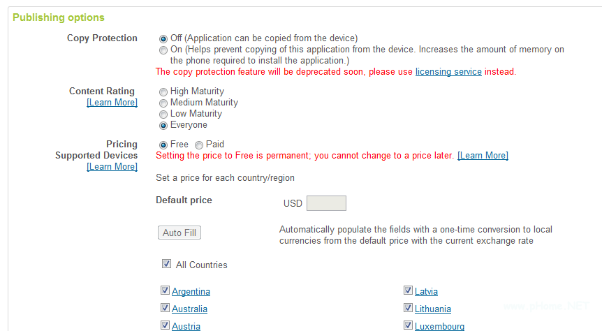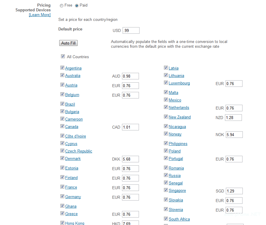 对于定价,要么选择免费,要么选择付费(如果选择永久免费,后期是不能改成付费的)。然后选择国家,每一个国家都可以设定价格(或选择自动填充)。你也可以随意的排除一些国家。这可能会违反要求我们向这些国家出售应用的法律。