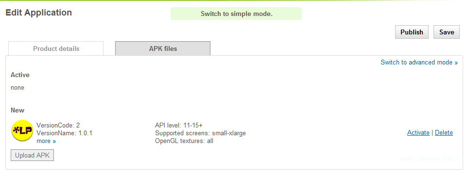 请切换到“APK files”选项卡,然后点击保存按钮(在右上角处)。请确保在你点击发布按钮之前,至少有一个APK是激活状态。