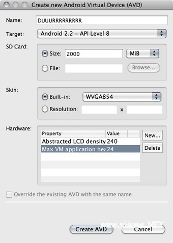 6、在这个窗口你可以设置模拟Android手机的参数。除去Android 2.2的强制目标设置,你需要设置的地方不多。你可以设置一个虚拟的SD卡,所以想设多大就设多大。而屏幕分辨率,不一定要选最高的选项(WVGA 854),它表示854像素高,如果你的电脑是MacBook或是其他的宽屏上网本,那可能超过你的电脑屏幕分辨率。