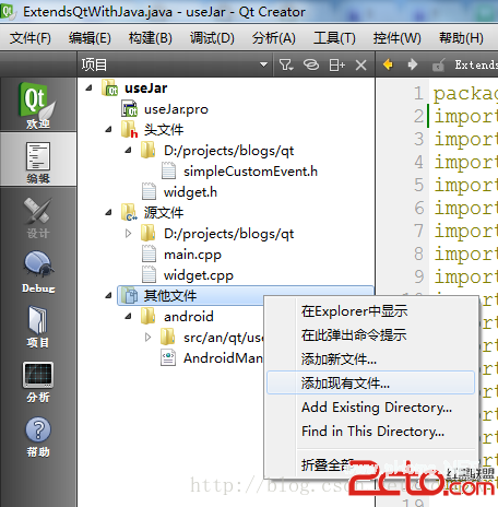 你可以任意的文本编辑器中编辑java源码,然后通过Qt Creator项目视图加到项目里,在其它文件那里鼠标右键点击,选择添加现有文件即可。参考下面几张图吧。