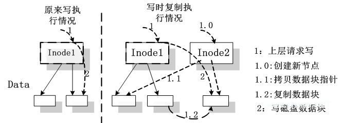 这种文件复制策略其实是一种惰性算法,也即我们常说的写时复制的方法,这个方法在 Linux 操作系统的子进程对父进程资源的继承中有所体现。这个策略一方面可以最大限度减少复制文件的数量,另一方面则可以避免瞬间过大的文件复制工作量,影响文件服务的性能。该算法的过程如下:当文件操作为写操作时,判断该文件是否版本生成后的第一次写操作;若是则利用文件系统提供的底层函数生成一个新的文件,复制源文件的数据到新生成的文件,同时把该文件当前版本的 inode 节点中的版本号置为当前版本号,这样新文件就成为该文件的最新版本。