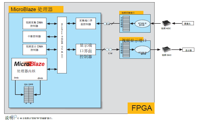 视频采集端口负责解码来自视频 ADC 的输入视频流数据并在本地缓存。随后该数据被转发至主存储器,用于创建视频帧。与此类似,视频显示端口负责对本地缓存中存储的视频帧数据进行编码,然后将其转发到视频 DAC 中供显示使用。视频输入输出端口连接到 MicroBlaze 主机处理器的主外设总线,该处理器负责处理与主存储器之间的视频数据流量。