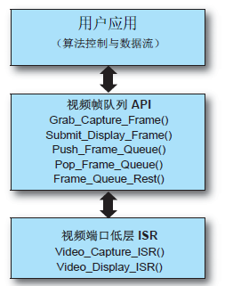 除了视频端口 ISR,还有我们称之为“视频帧队列 API”的一套高级视频帧队列管理功能在这些 ISR 和用户层应用之间工作。该 API 负责维持多个采集帧和显示帧的队列,以支持双帧或三帧缓存方案。在MicroBlaze上运行的用户应用能轻松获得视频采集帧,或利用“视频帧队列 API”功能提供视频显示帧。图 3 显示了在层级结构中各级别的相关功能。
