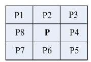 在提取指纹细节点时,首先为细化图像中的每个像素点P建立一个8邻域像素区,如图4所示。其中P1~P8为像素点P周围的邻近环绕像素点。P1~P8中黑色点的值设为1,白色点的值设为0.