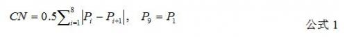 根据Crossing Number (CN)理论,在8邻域像素图中按照公式1计算像素点的CN值。例如在图2和图3中,8领域像素区域内中心点的CN值分别为1和3.