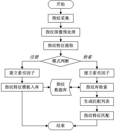 软件程序是整个指纹检索算法的映射与实现,它将算法的各个理论环节转化为实际的函数,并封装成可以在嵌入式系统下执行的功能模块。本文中嵌入式指纹检索程序实现用户指纹注册和指纹检索匹配两大功能,涵盖了指纹采集程序、指纹图像预处理程序、指纹特征提取程序、指纹索引与检索程序、指纹匹配程序等部分,其执行流程如图5所示。软件进入到执行状态后,首先按照用户指令参数进行模式判断,选择进入到指纹注册或者指纹检索状态。当选择指纹注册入库时,软件会先进行指纹图像采集,然后对图像进行预处理,接着提取出指纹的细节特征并建立指纹索引因子,最后将指纹特征模板和对应的索引因子入库保存。而当需要进行指纹检索时,系统同样会先进行指纹采集、图像预处理、特征提取和索引因子建立,然后利用索引因子进行指纹库检索,找出与查询指纹最相似的一批待匹配指纹,最后利用匹配程序对这部分指纹逐一对比,给出匹配结果。