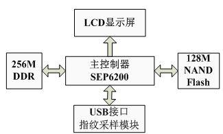 ,能够较好的执行指纹检索程序。主控制器配合DDR、Nand Flash、LCD、USB指纹采集器等外围设备,搭建成了完整的嵌入式指纹检索硬件平台,图6是所设计的嵌入式指纹检索系统的硬件框架结构图。系统中主控制器SEP6200用于控制指纹采样和进行任务调度;DDR模块用来临时存储指纹图像数据和执行软件程序;Nand Flash用以存放算法软件代码和指纹数据库;LCD显示屏在执行算法时用于提供良好的GUI用户界面;USB指纹采集器则是用来采集原始指纹图像,并将图像数据经USB接口传送至核心控制单元。