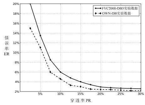 指纹检索算法的性能采用检索穿透率(Penetration Rate, PR)和检索错误率(Error Rate, ER)衡量。检索穿透率(PR)定义为检索得出的待匹配指纹数量占整个数据库的比重,该比重可以由算法程序员自行设定;检索错误率(ER)则定义为在某一穿透率的限制下,在待匹配指纹中未检测到目标指纹的概率,即检索失败率。在实验中利用所述的两个指纹数据库对系统进行测试,得到一系列的实验数据,将这些实验数据进行曲线拟合,绘制出如图9所示的曲线图。