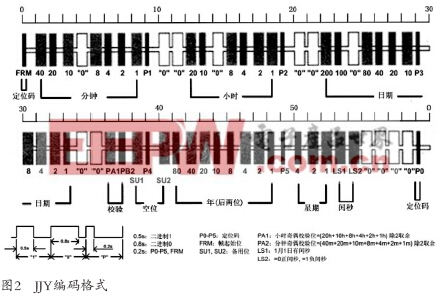 JJY 编码格式以 1 分钟为 1 帧,每秒接收 1 位时码信息。这些信息以 BCD 码格式表示,有不同的权重值。时码信息为脉冲信号,每秒的开始对应于 1 位脉冲信号的上升沿,这样可以与标准时间精确同步。不同的脉冲宽度表示不同的时码,高电平宽度为0.2s 表示定位码 P 码, 0.8s 表示逻辑 0, 0.5s 表示逻辑 1 。时间信息为各位数值乘以权重值的求和。在第 59 秒和第 0 秒连续两个定位码表示一个新帧的起始。时码信息中不包含月和日信息,而是包含 1 年从 1 月 1 日开始的天数。各信息位的含义见图 2。