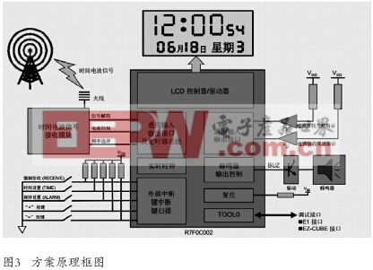 此电波钟具有 5 个独立的按键,分别完成接收授时电波并更新当前时间任务,时间设置任务以及闹钟设置任务。 LED 电路可对接收电波成功与否进行实时指示。整个方案原理框图如图 3 所示。