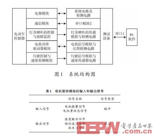 1 电动车控制器测试系统的组成及工作原理本文所针对的电动车控制器包括串口通信模块,前后灯及喇叭的控制与故障检测,速度控制与检测模块,电源控制模块,电机功率驱动等.由于电子元器件本身存在质量缺陷及生产中出现各种工艺问题,将会导致控制器硬件在某方面工作不正常,因此测试系统必须能够检测出硬件的所有问题,并快速定位.控制器输入信号有开关量.模拟量.脉冲量等,输出信号为驱动电机的模拟量,并有双向通信的串口信号.