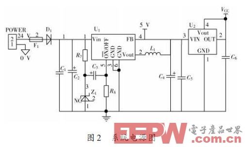 本系统选用LM2576和LM1117两个稳压器.分别提供5 V,3.3 V稳定的电压,为了防止短路加了保险丝F1.