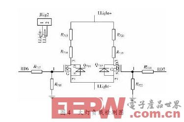 2.3 模拟灯及喇叭驱动电路的负载设计控制器对各种灯(大灯.转向灯.刹车灯)的驱动是在灯的两端加载24 V 电压,通过的电流是恒定的.因此模拟驱动电路的负载,就是在驱动电路的两端加上一个电阻模拟灯,使其通过的电流和灯相等.以左大灯为例,其他灯和喇叭控制电路原理相似,不再赘述.负载电路检测图如图4所示.