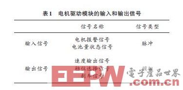 2.4 电机驱动模块的模拟设计电机驱动模块是电动车控制器的核心,包括速度控制输出信号,报警输入信号,紧急刹车输出信号,档位控制输出信号,电量状态输入信号等,见表1.