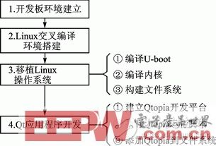 本系统在TQ2440开发板上移植了Linux操作系统,并在此嵌入式操作系统平台上进行了简易家居智能控制平台的开发。Linux移植及Qt应用程序开发步骤如图4所示。