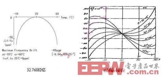 AT切晶体频率温度曲线为三次曲线,呈躺着的"S"型曲线,随着温度的变化,温漂呈"S"型轨迹变化,大致在-10℃和+60℃时,有两个"拐点",即温漂又会反方向拐回来。因此,只要控制好晶片的切角在一定的公差范围内,那么保证两个拐点温漂在-40℃~85℃时不超过±30ppm并不是一件难事。然而,AT切晶体只针对MHZ频率的晶体,如何转换成32.768KHZ频率,钟振32.768KHZ通过分频方式,便可以实现。如采用AT切16.777216MHZ晶体,通过512分频,那么就可以得到想要的32.768KHZ频率。钟振实现对频率的分频并不困难,都集成在振荡IC内部。因此,使用AT切MHZ 分频实现的32.768KHZ钟振,在频率温度特性上,有很大的改良,在没有进行温度补偿的时候,-40℃~85℃条件下,温度频差保持在±30ppm甚至±20ppm都是可以实现的。