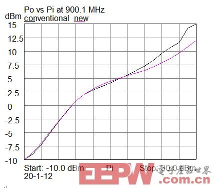 在900MHz时,两个配置拥有相同的输入限制阀值,大约为3dBm,如图7.一个常被忽略的优势是,在30dBm输入功率时新配置的输出泄漏功率可以低约4dB,不过我们无法解释这个改善的背后机制。