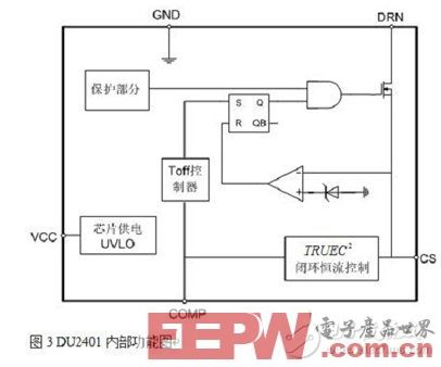 所谓的闭环,即真正检测输出电流值,以此为标准来发出PWM信号。所谓开环,不以检测到的输出电流值来做发出PWM信号的参考。从电路拓扑上,二者没有区别。但是在芯片内部对检测到的如图2 CS脚电感电流信号,做专利技术处理,如图3 TRUEC2部分。这样,就检测到了电感电流的平均值,也就是输出电流的平均值。芯片针对检测到的值,控制输出占空比,实现了闭环控制。
