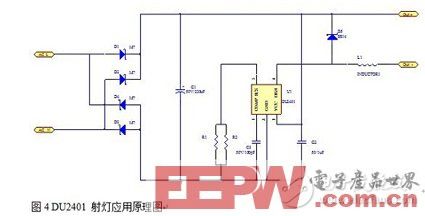 另外,图1 Rs电阻串联在Vin和LED负载之间,这意味着不论芯片内部开关管开通和关断,Rs都将通过电流。图2的全闭环LED射灯驱动电源中,Rs只在开关管开通的时候,有电流通过,这也是全闭环控制带来的好处。这样会带来一个非常显着的性能提高,因为Rs电阻的能耗减少,会提高整个系统的效率。DU2401达到了业内最高的98%的效率,正是基于这种全闭环控制策略。