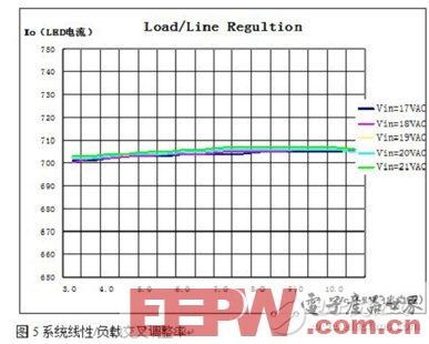 图5可以看到,由于闭环控制,在设计的正常工作范围内,输出电流维持定值,单颗系统可以认为是恒定的输出电流,即线性、负载调整率理论值是0.量产时,由于参数一致性分布,大量数据表明,恒流精度小于±0.9%.