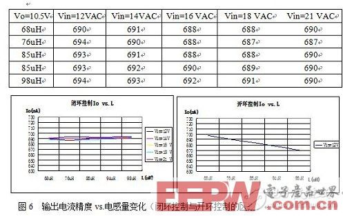 图 6 反映的是电感大范围变化(设计标称值68uH)时,输出电流的变化,如左图。如果这种测试用于目前市场上开环系统芯片,电流会出现线性的大范围波动,如右图。而DU2401 闭环的方式,使得输出电流依然保持±0.9%以内的恒流精度。充分说明了闭环系统对于整个系统恒流精度提高的重要性。