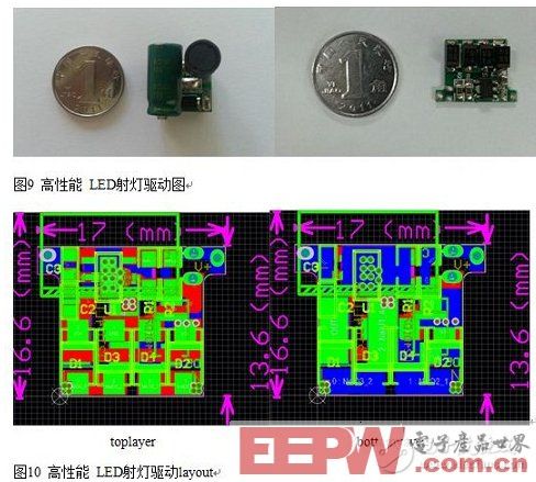 基于图 4 的极简线路,如图 9、图10 显示,此方案可以在非常小的尺寸下实现 3W 的输出功率。这样的小尺寸,对于空间狭小,要求很高的射灯,有实际的意义。高功率密度是LED 灯具对 LED 驱动电源提出的要求,更优的控制方式是实现更高的功率密度的根本途径。
