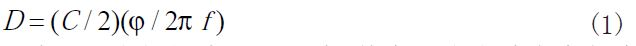 公式(1) 为相位式测距公式,其中C 为光波在空气中的传播速率,φ为调试的激光信号经过反射后而产生的相位差,f 为信号的调制频率。它可得到优于脉冲式飞行时间测量法的测距精度,但是测距速度慢,结构更为复杂,对于高速运动物体存在多普勒效应。
