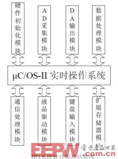 如图3 所示,系统软件由数据的采集、处理、显示等模块组成,这些模块由μC/OS-II 实时操作系统统一调度、运行,这样软件部分就变成了对各个任务模块程序的编写,数据的采集由AD 采集模块来完成,数据的处理由ARM 通信和数据处理模块、DA 转换模块等来完。显示主要是液晶的显示和驱动模块。其中底层驱动包括系统硬件的初始化、UART 接口的数据发送及接收的底层代码,液晶驱动模块包括液晶屏的点、线、汉字等内容显示的实现代码等等。